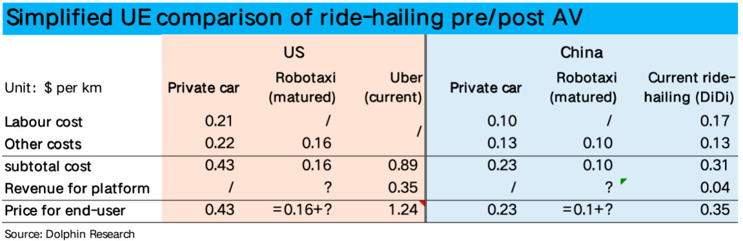 ② 中国市场:根据海豚投研的测算(也参考了其他机构),在技术完全成熟的情况下,国内网约车的运营成本可以低至每公里0.7~0.8元,约$0.1。背后的关键假设包括,普通Robotaxi的成本下降到约15万元,不再需要任何安全员, 保险、维修等运维成本每车每年约2万(每日55元)。