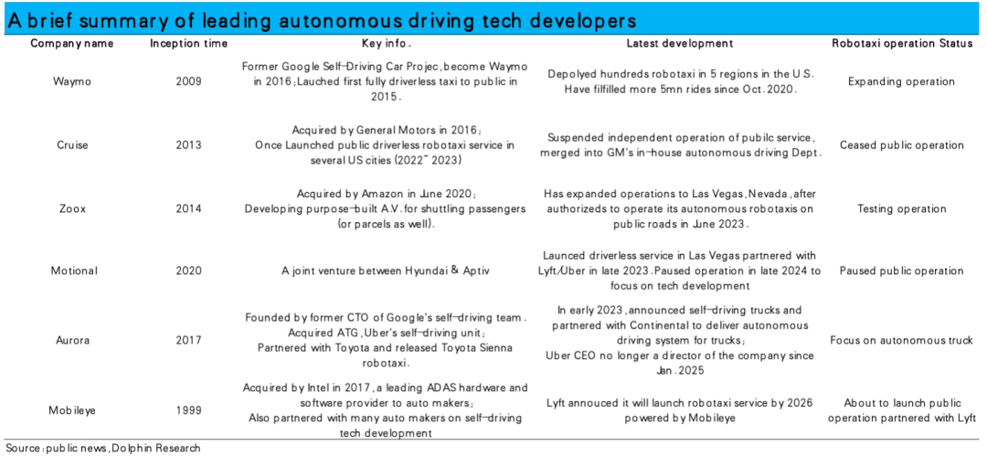 首先从自动驾驶开发者独立运营网约车平台的角度,当前独立开发自动驾驶技术的企业虽然相当众多(国内主要是各家车企自研,而海外则是第三方的独角兽机构为主),但其中相当一部分的发展里程并不顺利,当前能够向公众提供无人驾驶网约车服务的寥寥无几。