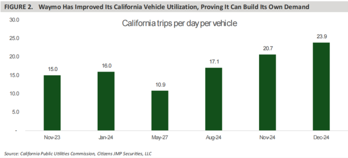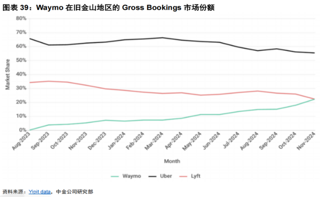 根据Yipit数据,在24年底时,Waymo在旧金山地区的网约车市场份额(按订单额算)已追上Lyft,市占率已略高于20%。相对应的,Uber和Lyft的市占率都较2023年的高点下降了10%左右。可见至少在旧金山地区,Waymo已经对存量网约车平台造成了显著的竞争,并已经达到了可比的体量规模。
