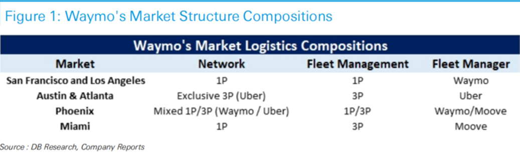 ① 平台端和车队端全部Waymo自行管理的纯1P模式;② 平台获客和车队管理全部由Uber负责的纯3P模式(Waymo仅提供自动驾驶技术和车辆);③ 车队由Waymo管理,但可同时从自营平台和Uber平台获客的1P/3P混合模式;④ 由Waymo自营平台获客,但交由第三方Moove管理车队。类似于模式①的轻资产化。