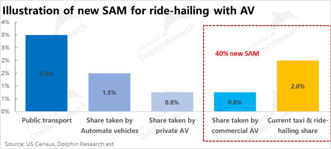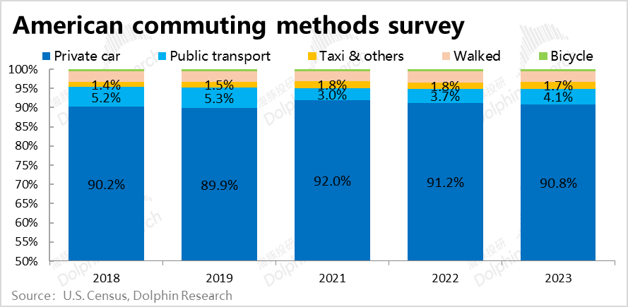 ① 通过侵蚀公共交通份额,取得的增量市场空间:根据前文的数据,美国的上班通勤情景下,公共交通的使用比重大约在4%上下。考虑到公共交通在其他场景下的使用率应当更低一些,假设全场景公共交通的使用比重约3%(4%的70%~80%左右)。