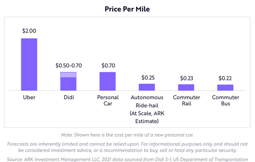而随着自动驾驶的普及,网约车在比公共交通便捷的同时,也有希望在使用成本上与公共交通的成本接近。根据ARK的测算,自动驾驶技术成熟且运营规模化后,无人驾驶网约车的运营成本可以压缩到约$0.25每英里(我们自己测算后能够得到相近的数字,但需要注意这个数字只考虑了成本,还没考虑运营方的利润空间),与地铁和公交车平均每英里价格$0.22~$0.23的价格已近乎没有差距。