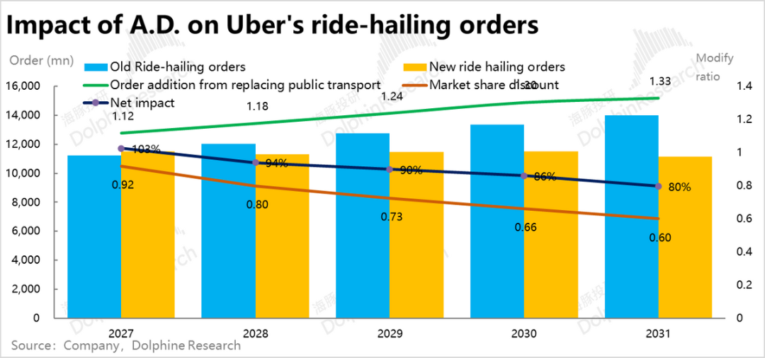 综合上述两点的影响,我们测算出在自动驾驶的影响下,2031年Uber的网约车订单量会是原先预测的80%。