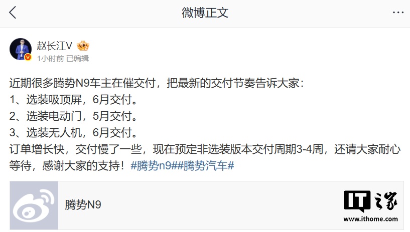 IT之家 4 月 8 日消息,针对近期腾势 N9 车主催交付的情况,比亚迪腾势销售事业部总经理赵长江今日发文公布了最新的交付节奏: