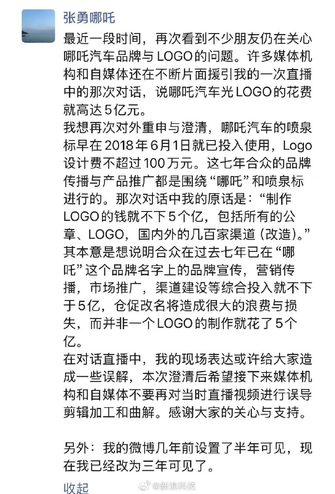 IT之家 4 月 18 日消息,哪吒汽车前 CEO 张勇今日于其微信朋友圈发文,称哪吒汽车的 LOGO 花费 5 亿元不实,并解释了此前微博不可见的原因。