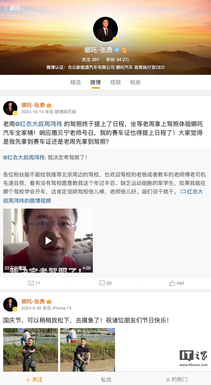根据IT之家此前报道,4 月 17 日,张勇微博账号中所有内容已无法查看,不过其短视频平台账号正常可见;目前其微博已恢复查看,但并没有任何内容更新,最近一条微博为 2024 年 10 月 14 日转发并评论周鸿祎考驾照。