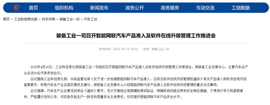 工信部装备工业一司组织召开智能网联汽车产品准入及软件在线升级管理工作推进会,强调汽车生产企业要充分开展组合驾驶辅助测试验证,明确系统功能边界和安全响应措施,不得进行夸大和虚假宣传,严格履行告知义务。企业应当规范营销宣传行为,向消费者提供真实、全面的信息,确保消费者正确理解和使用智能网联汽车产品。同时,驾驶人也应提高自身的交通安全意识,正确理解和使用智能网联汽车产品,确保行车安全。