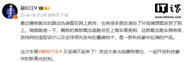 IT之家 4 月 18 日消息,比亚迪腾势销售事业部总经理赵长江今日发文称,腾势的首款概念超跑会在上海车展亮相,这款概念跑车拥有极致纯粹的造型设计以及全球领先发布的重磅技术,是一款科技豪华拉满的产品。