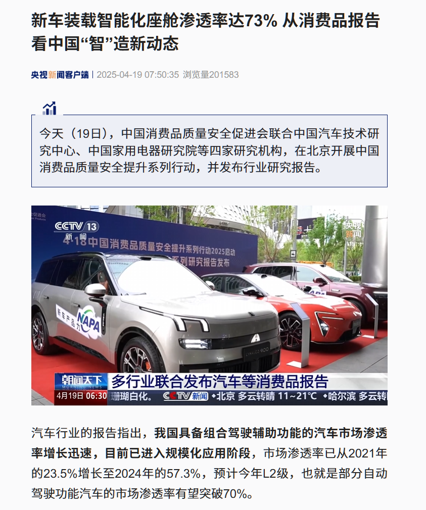 IT之家 4 月 19 日消息,据央视新闻今日报道,中国消费品质量安全促进会联合中国汽车技术研究中心、中国家用电器研究院等四家研究机构发布行业研究报告。