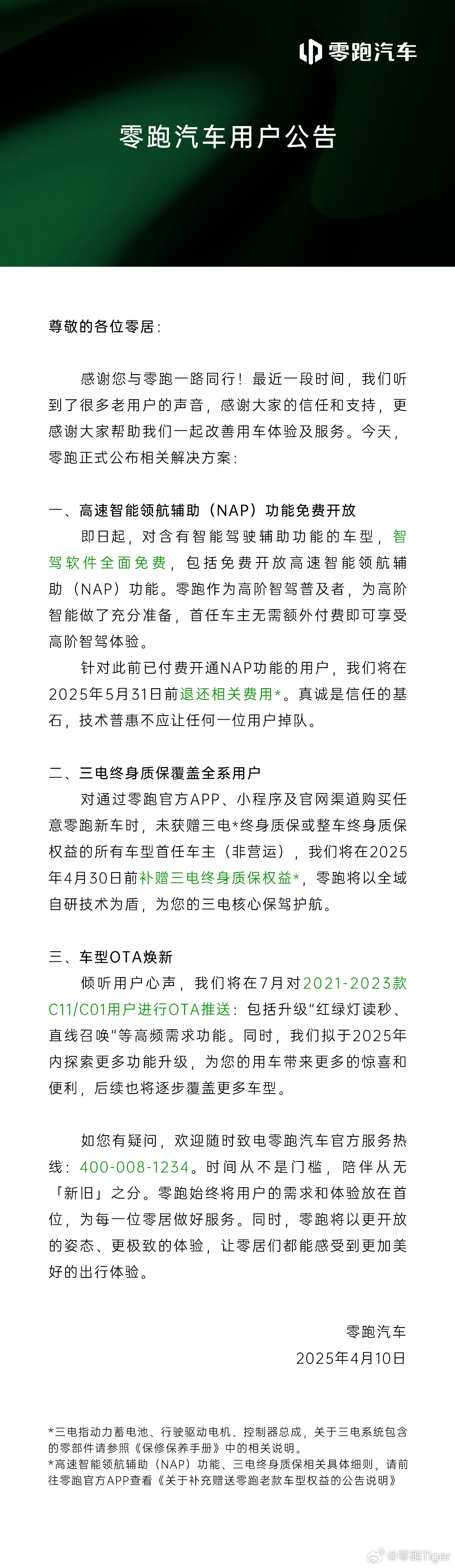 此外,零跑宣布三电终身质保覆盖全系用户,对通过零跑官方 App、小程序及官网渠道购买任意零跑新车时,未获赠三电终身质保或整车终身质保权益的所有车型首任车主(非营运),官方将在 2025 年 4 月 30 日前补赠三电终身质保权益。