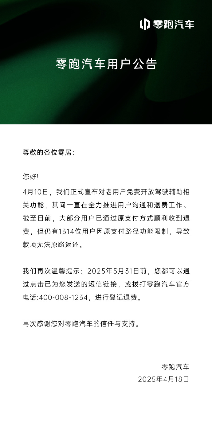 IT之家 4 月 19 日消息,零跑汽车昨晚发布公告称,4 月 10 日,我们正式宣布对老用户免费开放驾驶辅助相关功能,其间一直在全力推进用户沟通和退费工作。截至目前,大部分用户已通过原支付方式顺利收到退费,但仍有 1314 位用户因原支付路径功能限制,导致款项无法原路返还。