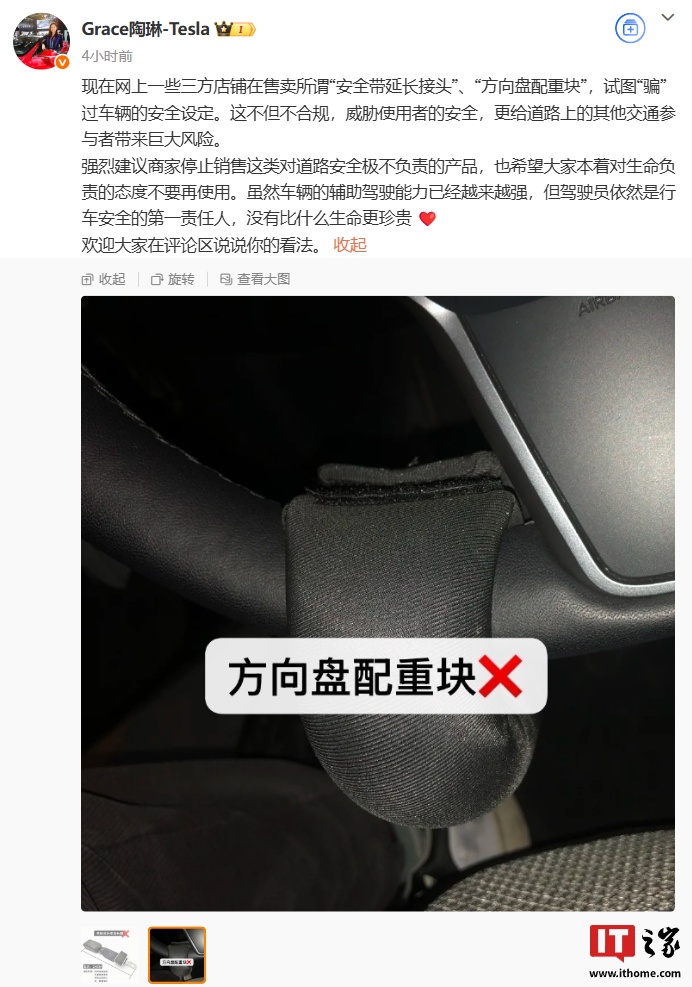 IT之家 4 月 20 日消息,特斯拉公司副总裁陶琳今日发文称,现在网上一些三方店铺在售卖所谓“安全带延长接头”、“方向盘配重块”,试图“骗”过车辆的安全设定。这不但不合规,威胁使用者的安全,更给道路上的其他交通参与者带来巨大风险。