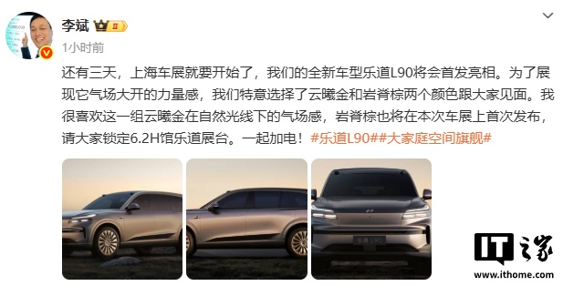 IT之家 4 月 20 日消息,蔚来创始人、董事长、CEO 李斌今日发文称,全新车型乐道 L90 将会在上海车展首发亮相,特意选择了云曦金和岩脊棕两个颜色跟大家见面。