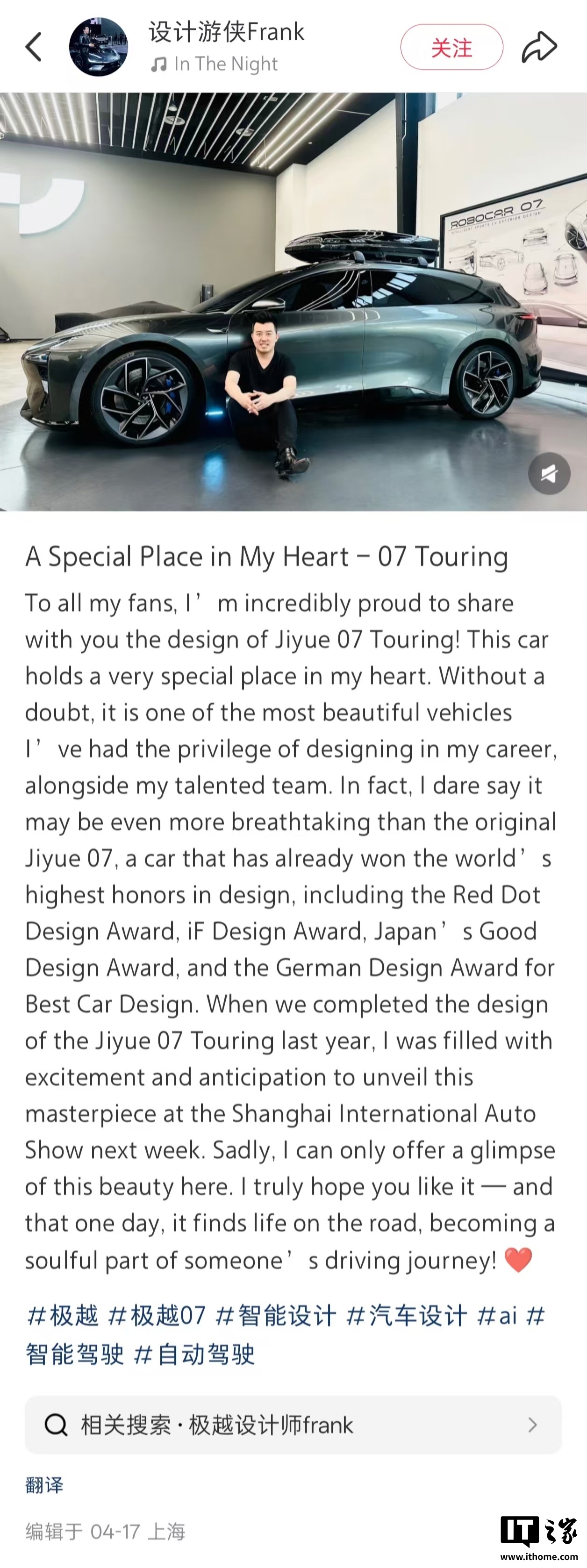 IT之家 4 月 21 日消息,近日极越汽车前设计总监 Frank Wu(吴凡)通过社交媒体分享了极越 07 旅行版的硬质模型图以及自己与该车型的合照,这款原本计划在今年上海车展上发布的车型,因极越汽车的倒闭而未能与大众正式见面,令人惋惜。