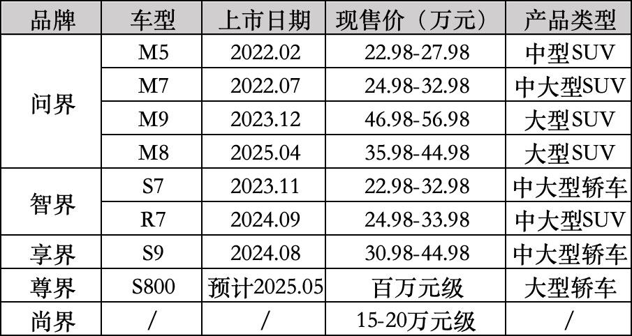 该体系下现有7款、共11个车型(增程版、纯电版)车型在售。传统的华为消费及电子产品(即手机、平板电脑等)门店展厅面积较为有限,大多仅可摆放1-4辆汽车。如在北京市朝阳区某商场一楼华为门店中,仅展出了享界S9增程版、智界R7增程版2个车型。