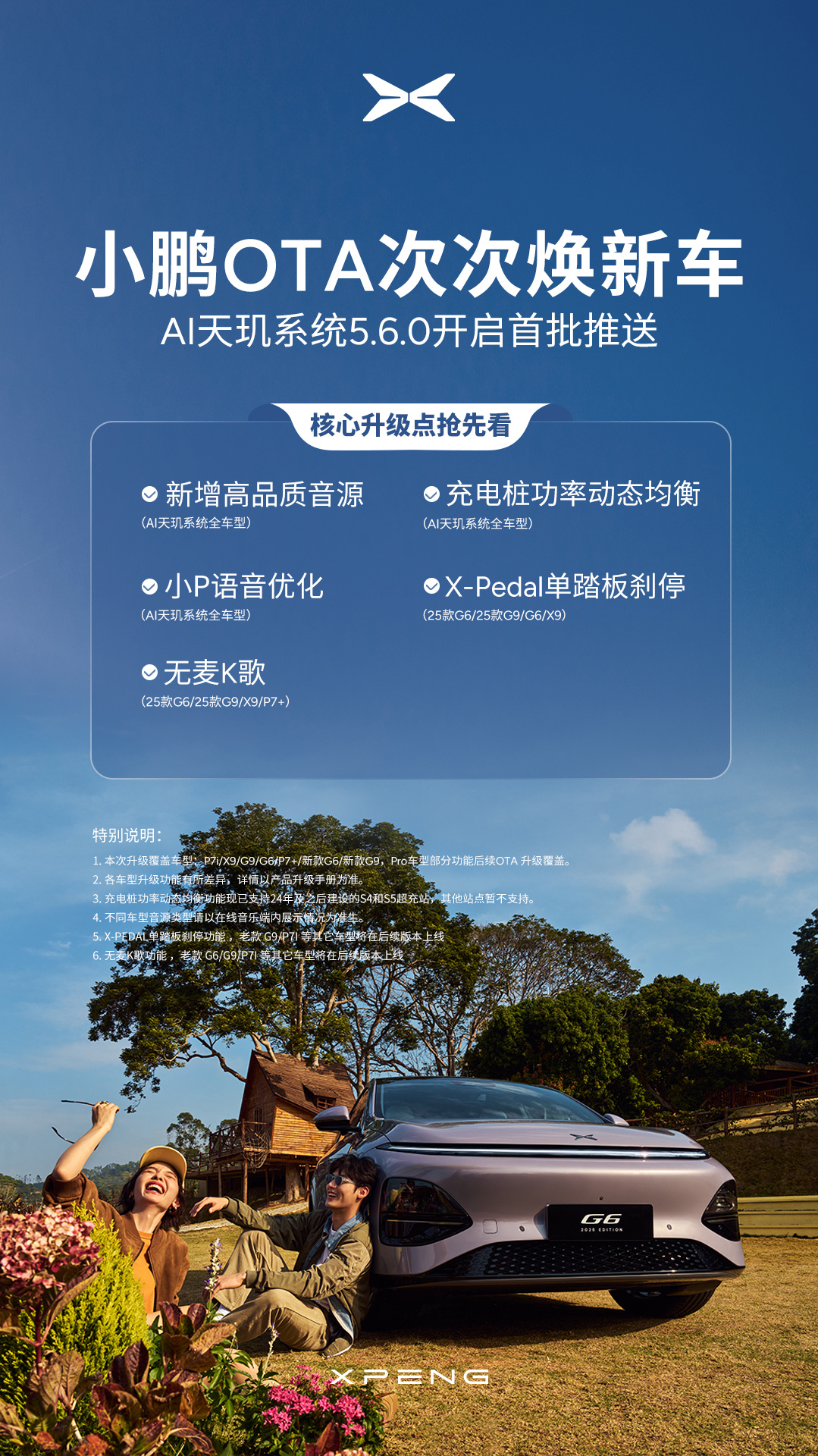 IT之家 4 月 21 日消息,小鹏汽车宣布 AI 天玑系统 5.6.0 今日开启首批推送,本次升级覆盖车型包括 P7i / X9 / G9 / G6 / P7+/新款 G6 / 新款 G9,Pro 车型部分功能后续 OTA 升级覆盖。