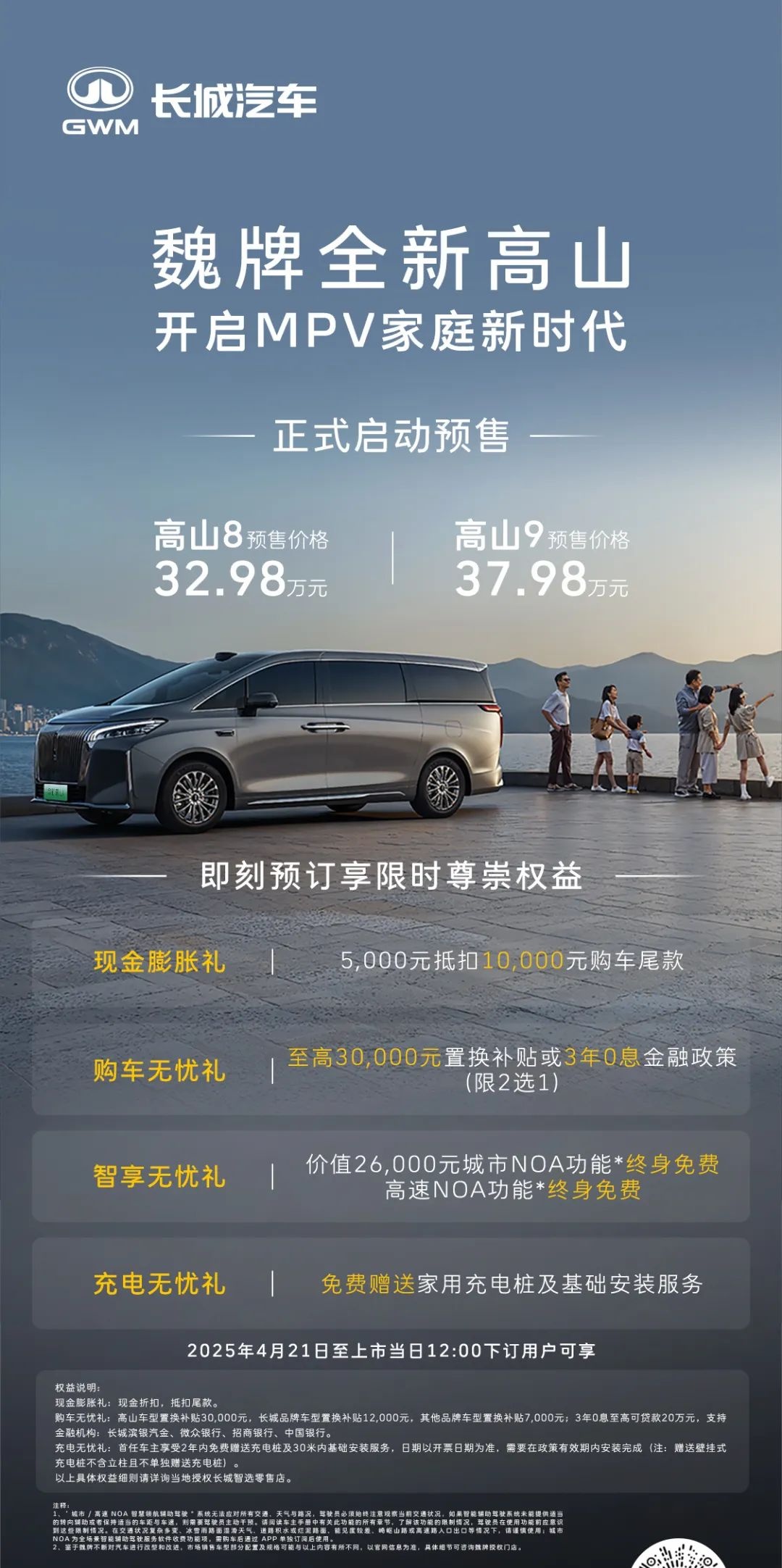 IT之家 4 月 21 日消息,在 2025 上海车展开幕前夕,长城魏牌全新高山 MPV 开启预售,共推出 3 款不同尺寸车型,分别命名为高山 7、高山 8、高山 9。其中高山 8 预售价为 32.98 万元,高山 9 预售价为 37.98 万元,高山 7 价格暂未公布。