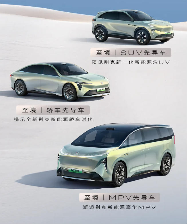 此次发布的“至境”SUV先导车、“至境”轿车先导车和“至境”MPV先导车,分别代表了别克在新能源SUV、轿车和MPV三个细分市场的最新成果。
