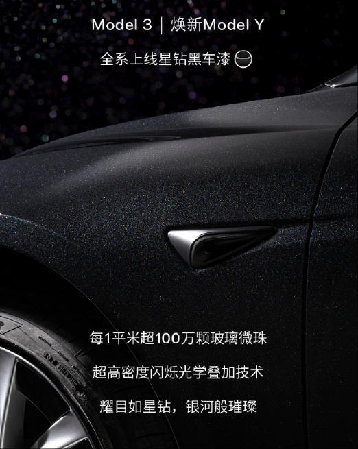 此外,Model 3/焕新Model Y全新车漆星钻黑上线,官方表示采用超高密度闪烁光学叠加技术,每1平米超100万颗玻璃微珠。