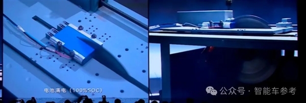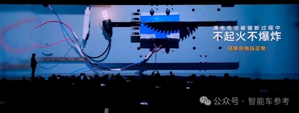 宁德时代现场还展示了钠新电池的安全实验,比如电钻冲击、电锯切割。