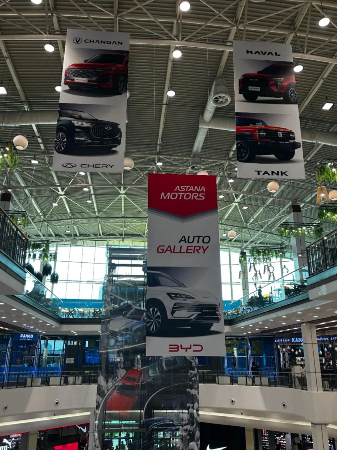 哈萨克斯坦阿拉木图最大的商场里,中国品牌汽车的广告。在电动汽车领域,中国品牌在技术方面有不小优势。摄/ 王靖扬