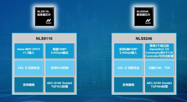 据介绍,纳芯微本次推出的车规级SerDes芯片组,包括了单通道的加串器芯片NLS9116和四通道的解串器芯片NLS9246。是公司专为ADAS(摄像头、域控制器)及智能座舱(摄像头、显示屏、域控制器)系统中的高速数据传输场景而设计的。