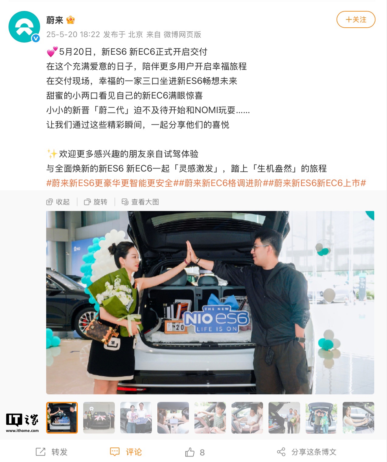 IT之家 5 月 20 日消息,蔚来宣布旗下新 ES6 / EC6 车型今天正式开启交付,系列车型于 5 月 16 日上市,定价为 26.8 万元起(新 ES6 整车购买价格 33.8 万元起、电池租用方案 26.8 万元起;新 EC6 整车购买价格 35.8 万元起、电池租用方案 28.8 万元起)。