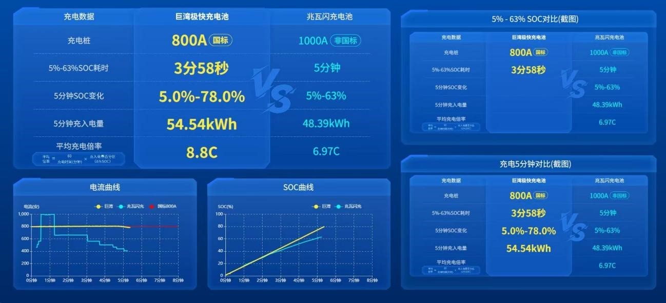 5月20日,巨湾技研完成了充电新国标发布后的行业首次公开测试。测试结果表明,基于 800A 国标充电桩,其 XFC 极快充电池在 5%-63% SOC 区间充电耗时仅 3 分 58 秒,较兆瓦闪充时间快 62秒;5 分钟充入 54.54kWh 电量(5%-78% SOC),平均充电倍率达 8.8C,超越友商在 1000A 非国标桩上的表现。