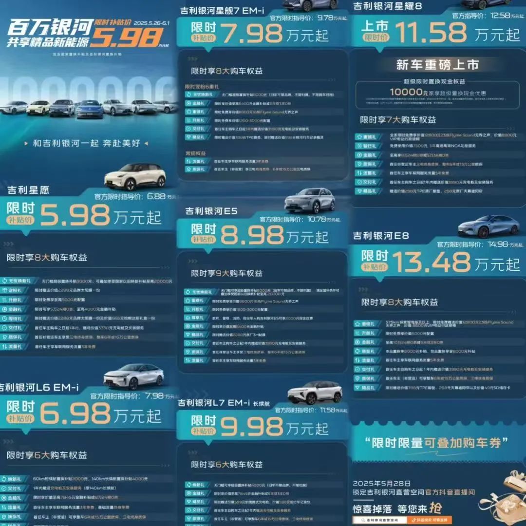 很快,降价潮的跟进就在汽车圈蔓延开来。5月26日下午,吉利银河也宣布加入价格战,覆盖多款热门车型,补贴幅度从5000元至1.8万元不等,特别是吉利银河的爆款车型星愿,将原本接近7万元左右的车型,限时起步价直接拉到了5.98万起,还有像L6、星舰7、E5 等,直接也给出了6.98万、7.98万、8.98万元的价格,基本上贴着比亚迪开打。