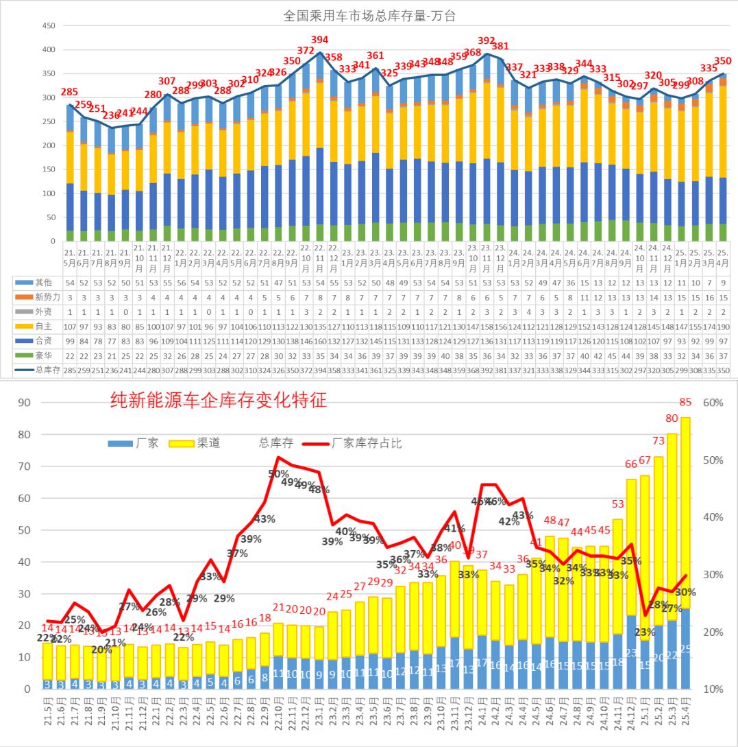 另一方面则是供需平衡的问题,终端经销商的库存爆表了,一周前乘联会发布的消息称,乘用车库存突破350万台大关,创下历年同期最高纪录。其中新能源库存已经达到了近几年的历史峰值,为85万辆,总体压力持续加大。