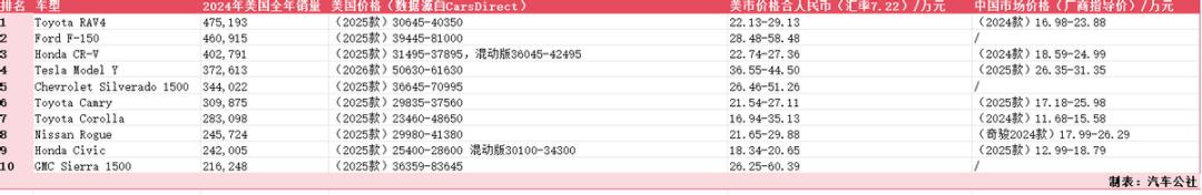 以美国2024年销量前十的车型为例,除却3款皮卡无法进行销量对比外,余下几款车型无一例外,均是美国售价更高。