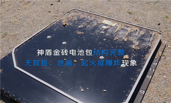 实验中,这台真正的“坦克”直接单侧碾过E5的电池包,可以看到电池包结构完整,无鼓包、泄漏、起火或爆炸现象,也就是金属框架有些变形,“衣角微脏”。