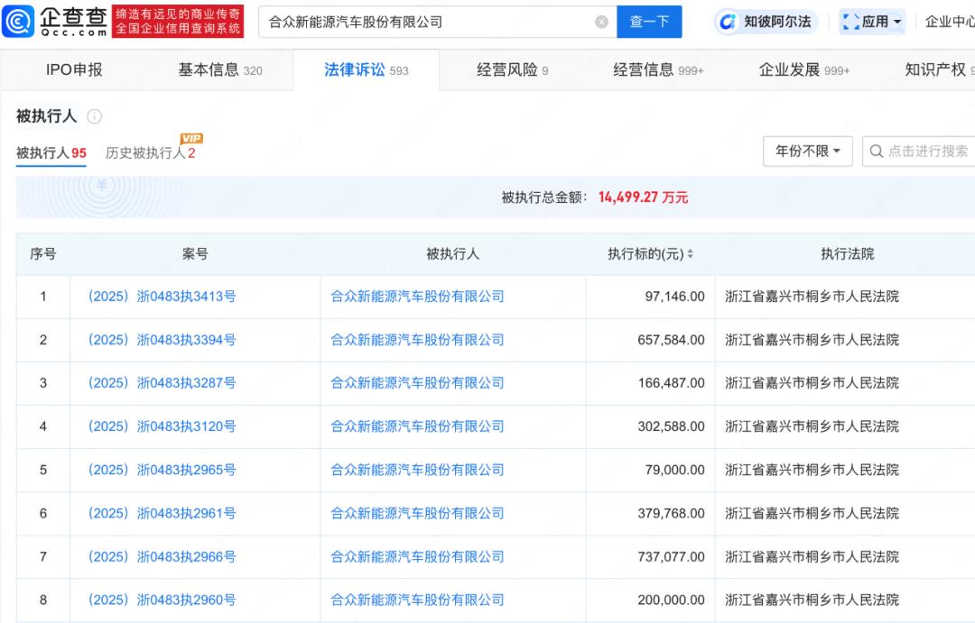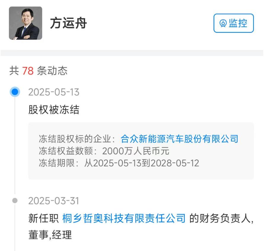 5月,天眼查APP显示,哪吒汽车母公司合众新能源汽车公司新增股权冻结信息,方运舟被列为被执行人,冻结股权数额2000万元。且截止5月,合众新能源名下涉及司法案件信息已经达到400多条,被列为被执行人达95次,被执行金额达到约1.45亿元。