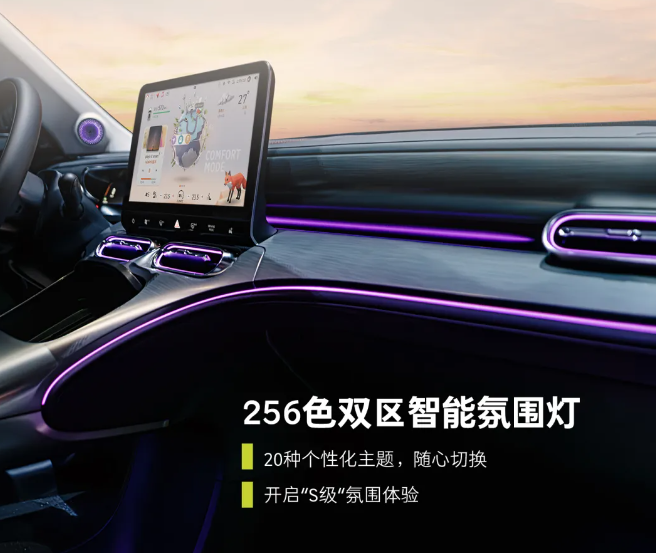 车内配备 256 色双区智能氛围灯,20 种个性化主题随心切换;森海塞尔典范音响系统,13 扬声器布局,3 种特调音效;3 款灵感主题桌面,精灵助手接入 AI 大模型;smart Breathe 呼吸净护系统,有效去除甲醛等有害气体,对 PM2.5 的拦截效率达 99.9% 以上。该车拥有 84% 得房率,1040mm 后排头部空间同级第一,21 处储物空间 + 986L 可变后备箱。