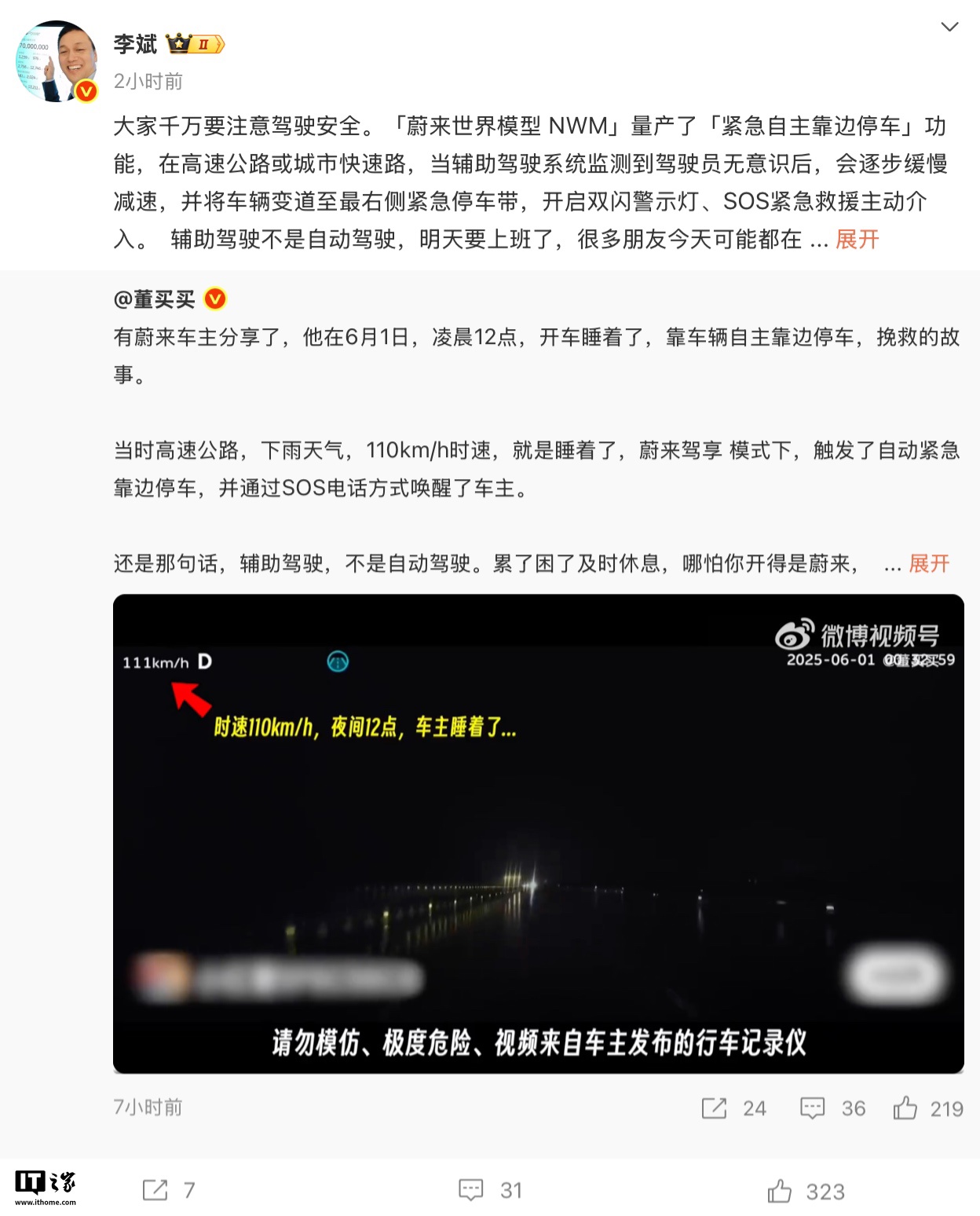IT之家 6 月 2 日消息,蔚来李斌今天转发一位博主“下雨天 110km/h 高速开车睡着,车辆触发自动紧急靠边停车,并通过 SOS 电话方式唤醒车主”的事例,再次强调辅助驾驶不是自动驾驶,车主应注意安全。