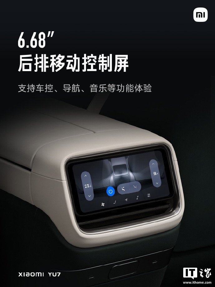 我们在小米 YU7 的后排配备了一块 6.68 英寸可移动控制屏,方便后排乘客实现导航、音乐、座椅、空调等便捷操控: