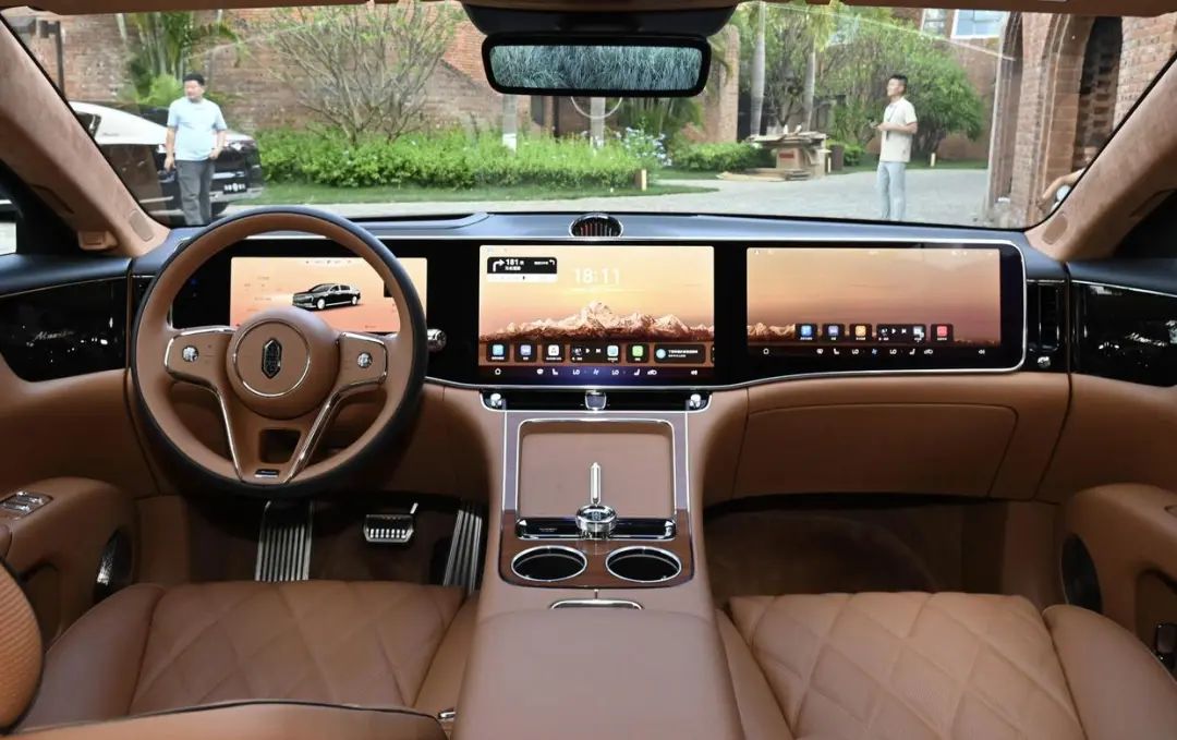 内饰采用了暖色调,棕色配合木质饰板营造出一种稳重且豪华的高级氛围。后排座椅中间采用多功能中岛设计,集成铝合金桌板、冷暖杯托、无线充电、压缩机冰箱、指纹密码箱等功能。车内采用4温区设计,车辆还能根据外部环境变化,智能调节各个温区的温度、风向和风量。