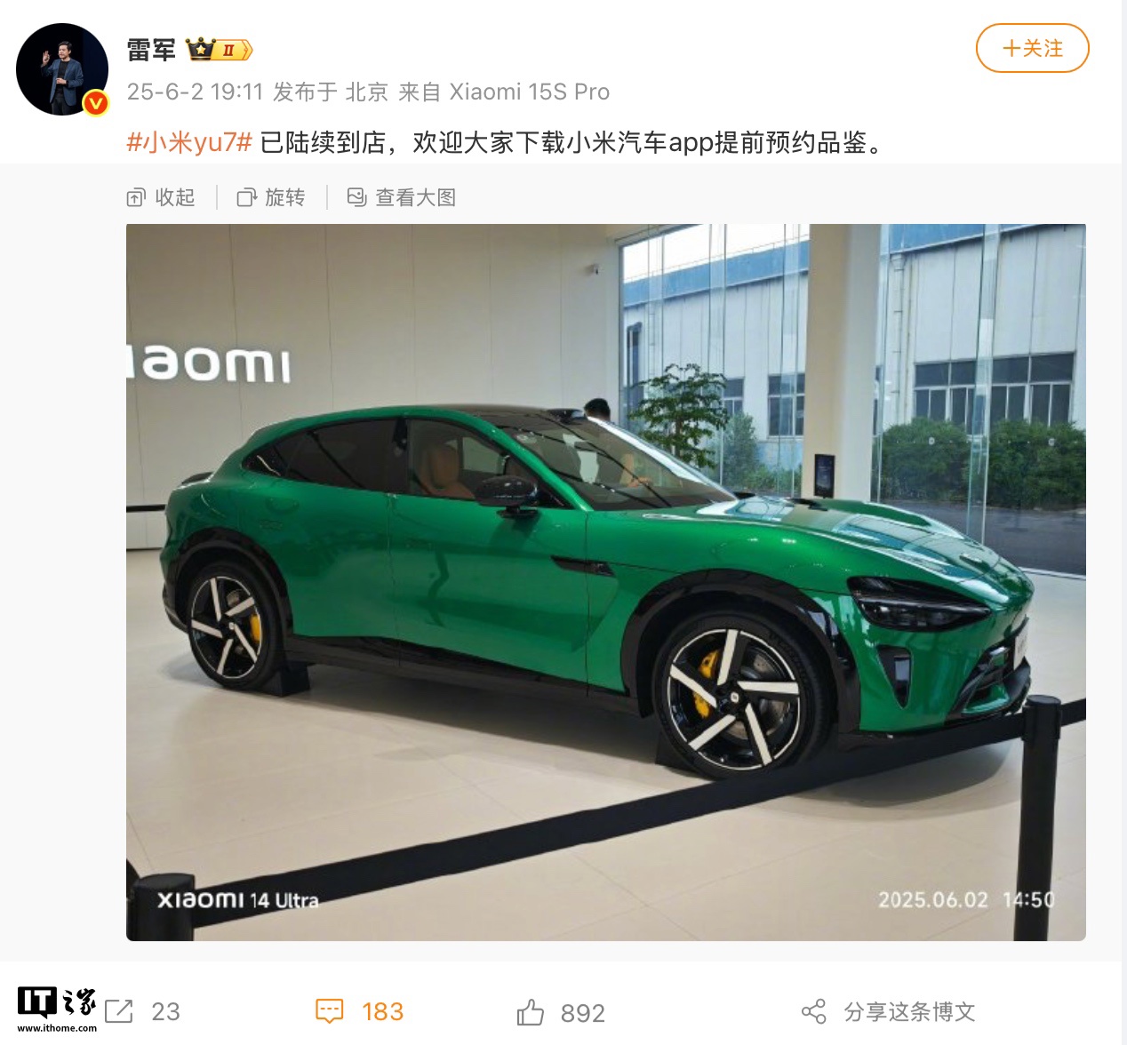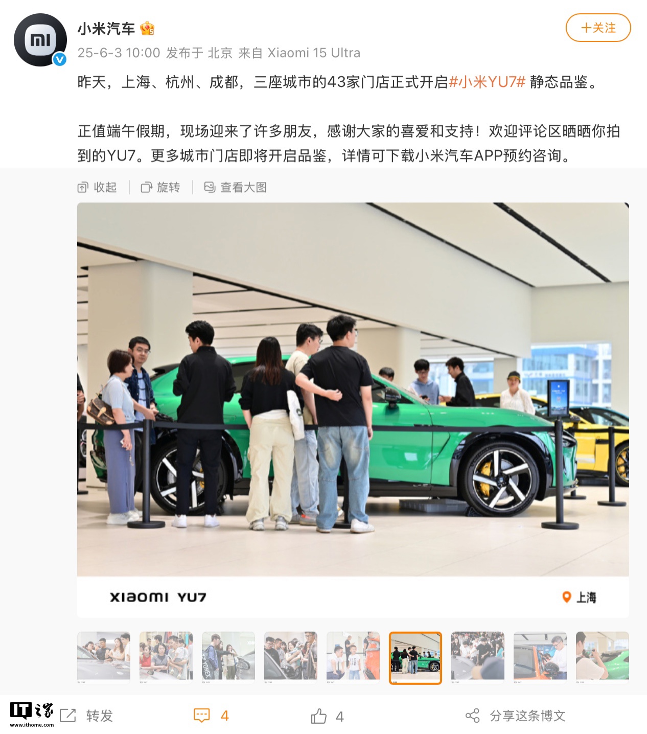 IT之家 6 月 3 日消息,小米汽车发文,宣布上海、杭州、成都,三座城市的 43 家小米汽车门店已正式开启 YU7 车型线下静态品鉴,用户可以下载小米汽车 App 提前预约品鉴。