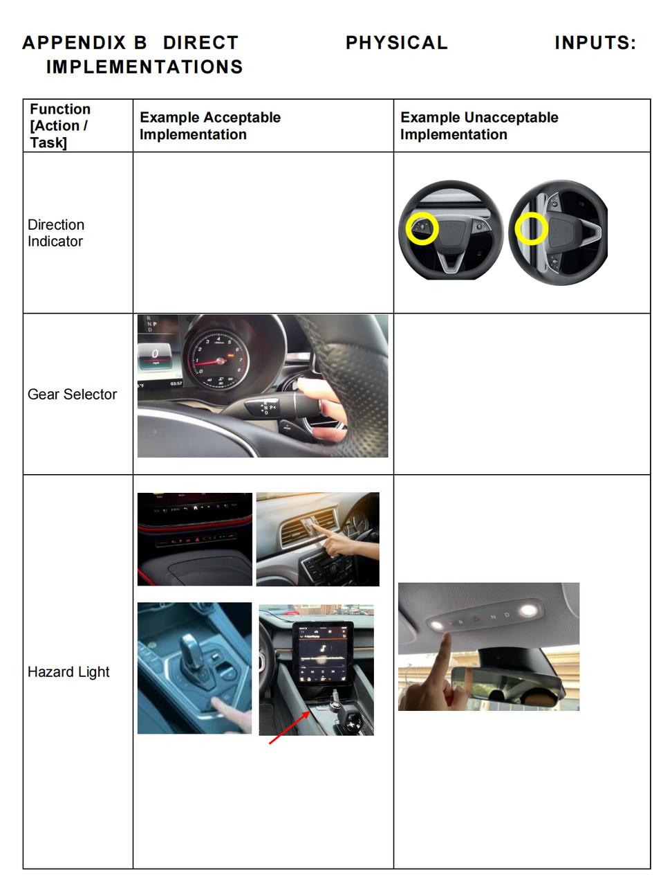 在 E-NCAP 技术公告的附录里可以看到,特斯拉的一些设计直接被当作反面案例,像按键打转向、天花板双闪都被形容为不可接受的(unacceptable)。