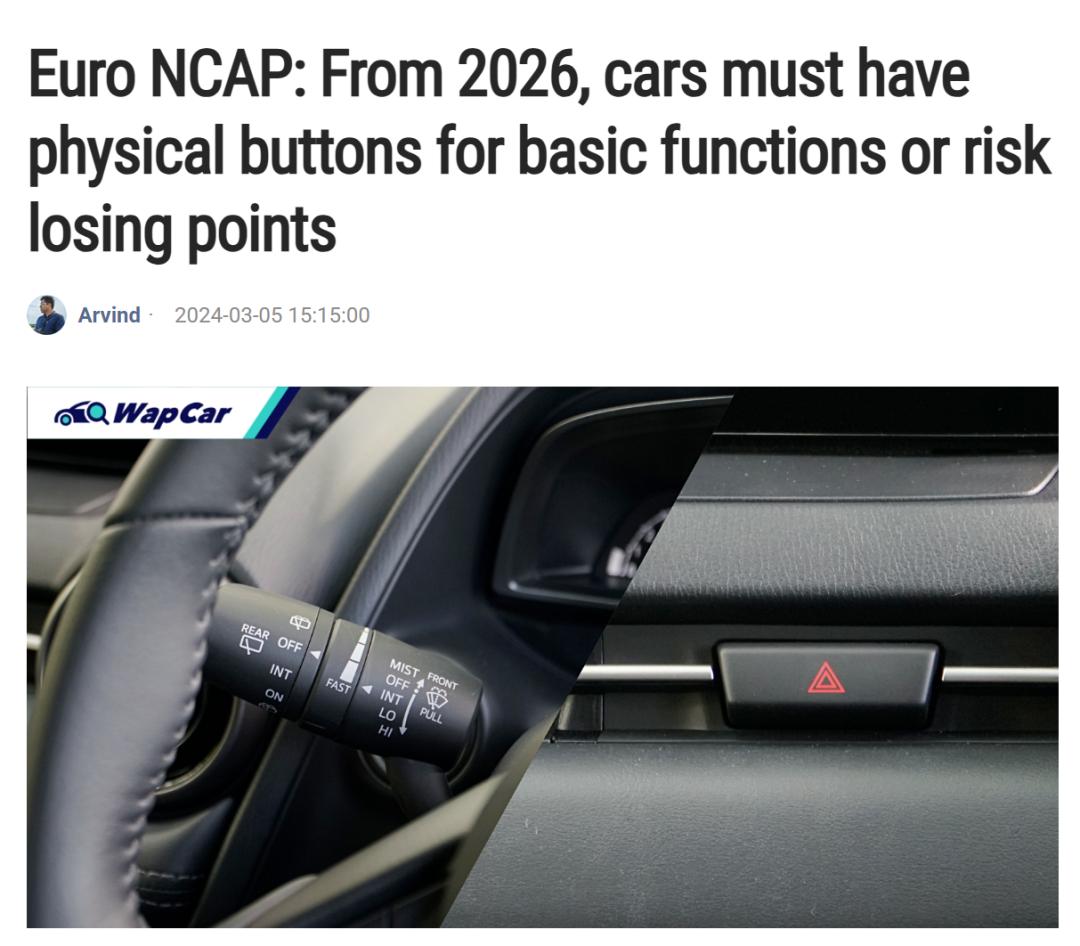 要说这波反思潮的源头,其实可以追溯到去年 3 月,当时 E-NCAP (欧洲新车安全评鉴协会)就声明:从 2026 年起,只有配备物理按键的汽车,才有资格获得 E-NCAP 的五星认证。