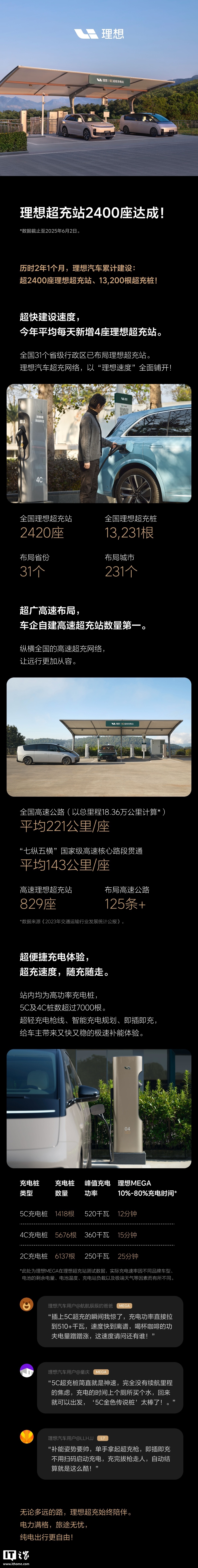 IT之家 6 月 3 日消息,IT之家从理想汽车官微获悉,历时 2 年 1 个月,理想超充站突破 2400 座,理想超充桩突破 13,200 根。