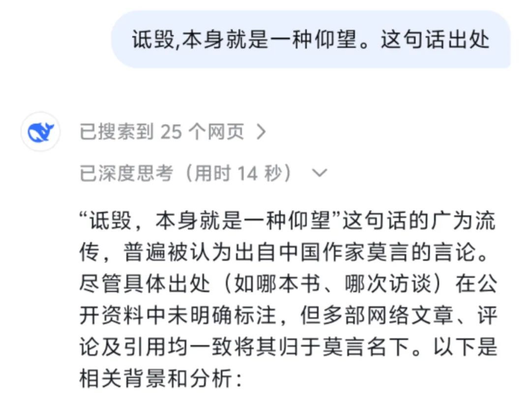 DeepSeek一番后,也没有查到所谓「莫言名言」的相关出处。或许是来自首富和知名作家的私人对话吧(doge)。