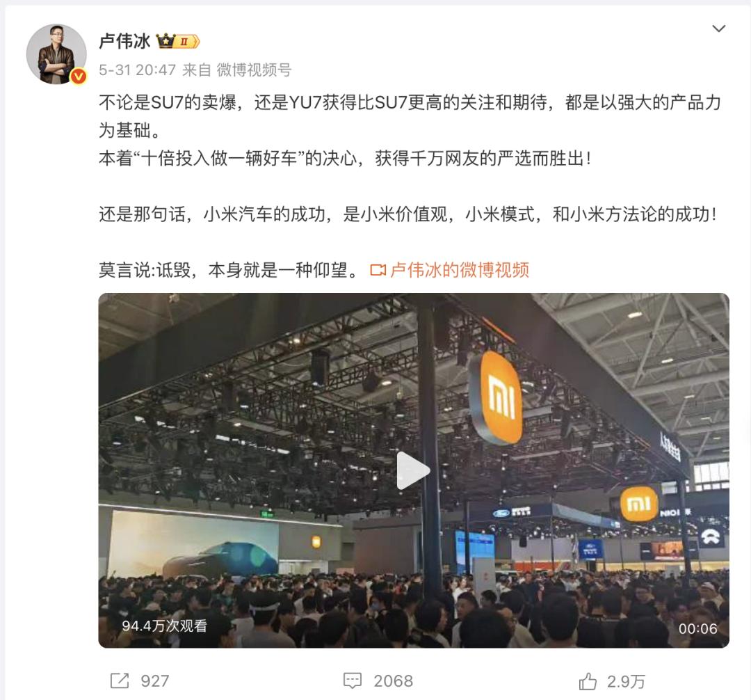 卢伟冰先手开团,从大湾区车展的热闹场面切入,解释了小米造车成功之元,最后结尾用了一句不知道在哪儿看的莫言名句: