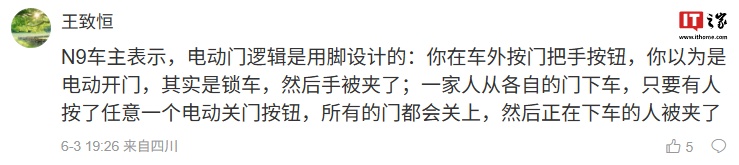 据该微博下的用户反馈,比亚迪腾势 N9 汽车电动门逻辑存在问题:门把手缩回时,按把手上按钮才能电动打开,如果把手弹出了,此时按下按钮将缩回门把手。