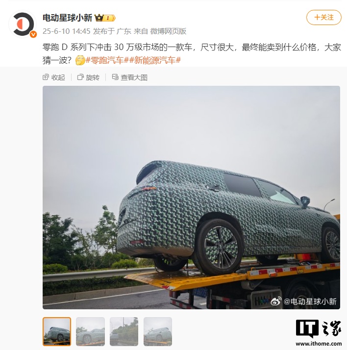 IT之家 6 月 10 日消息,网上日前出现了一款车型的伪装图,博主 @电动星球小新 表示这是零跑 D 系列下冲击 30 万级市场的一款车,尺寸很大。