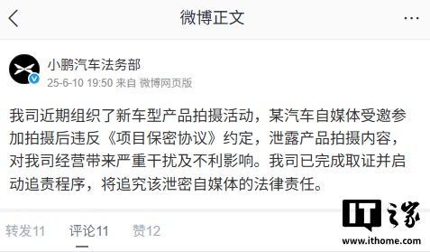 IT之家 6 月 10 日消息,小鹏汽车法务部今晚发文,称公司近期组织新车型产品拍摄活动,但某汽车自媒体受邀参加拍摄后违反《项目保密协议》约定,泄露产品拍摄内容,对公司经营带来严重干扰及不利影响。