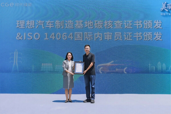 常州 2025年6月10日 /美通社/ -- 2025 年 6 月 5 日,理想汽车 "美丽中国我先行" 环境日主题活动在常州举行,活动现场,SGS 向理想汽车北京和常州智能制造基地颁发碳核查证书,并对研发、制造、供应链等部门授予 ISO 14064 温室气体内部核查员证书。理想汽车制造运营负责人卫延、SGS通标常州分公司总经理朱眺茵共同出席颁证仪式。