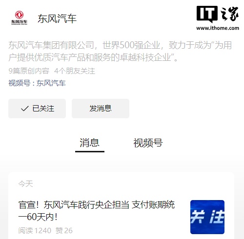 IT之家注:IT之家 6 月 10 日消息,东风汽车集团有限公司(以下简称东风汽车)今日发文,为深入贯彻落实国家政策精神,助力中小企业健康发展,东风汽车正式宣布,将支付账期统一至 60 天内。