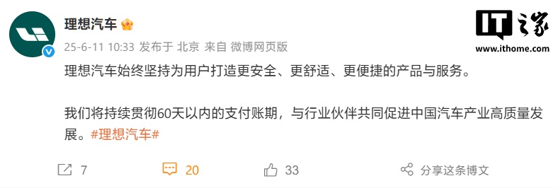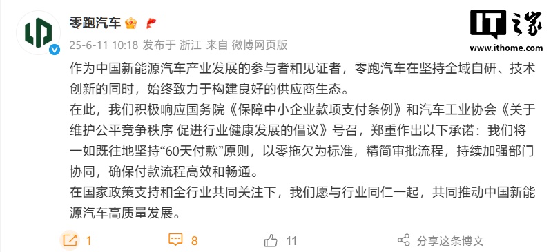 IT之家 6 月 11 日消息,昨日至今,多家车企陆续宣布将供应商支付账期统一至 60 天内。刚刚,两家造车新势力理想汽车、零跑汽车均发文宣布将坚持贯彻 60 天内支付账期。