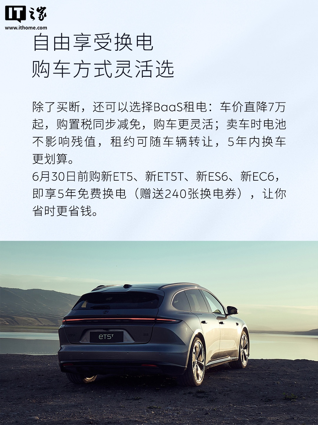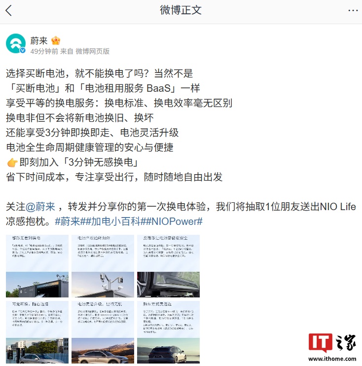 IT之家 6 月 12 日消息,蔚来官方微博今日发文介绍了买断电池和电池租用服务。官方表示「买断电池」和「电池租用服务 BaaS」一样享受平等的换电服务:换电标准、换电效率毫无区别,同时换电非但不会将新电池换旧、换坏,还能享受 3 分钟即换即走、电池灵活升级。
